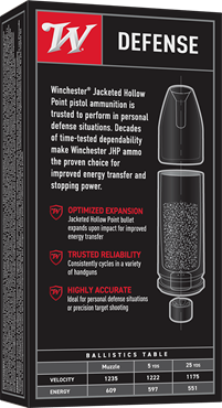 Winchester Jacketed Hollow Point pistol ammunition is trusted to perform in personal defense situations. Decades of time-tested dependability make Winchester JHP ammo the proven choice for improved energy transfer and stopping power.