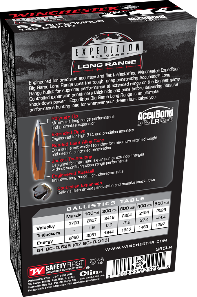 Flat shooting with pinpoint accuracy, Winchester Expedition Big Game Long Range uses the tough, deep penetrating Accubond Long Range bullet for supreme performance on the biggest game even at longer distances. Controlled expansion allows for penetrating thick hide and bone before delivering massive knock-down power. Expedition Big Game Long Range is an ultimate performance hunting load for wherever your dream hunt takes you.