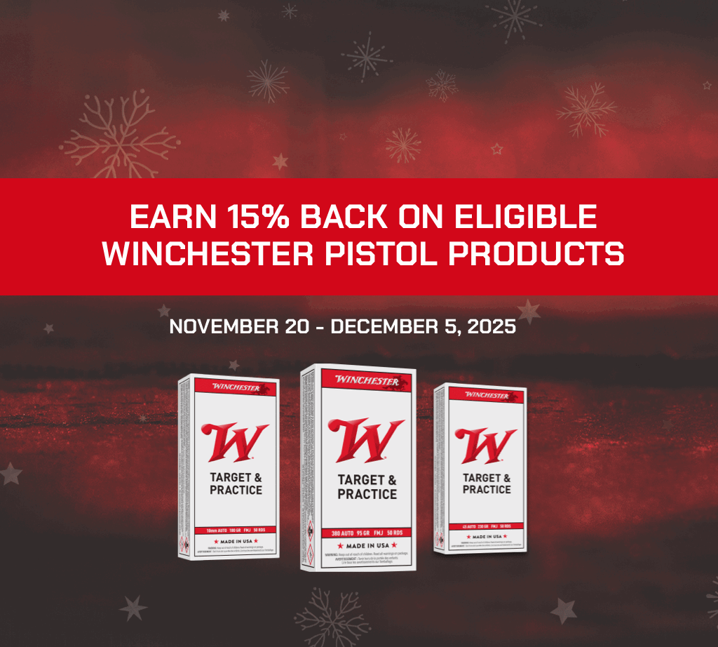 For a limited time, earn 15% back on eligible Winchester pistol ammunition. Minimum one box purchase to qualify and maximum rebate amount is $50 per household. Offer is valid on qualifying purchases made between November 20, 2025 – December 5, 2025. Offer expires and all requests must be postmarked no later than December 22, 2025.